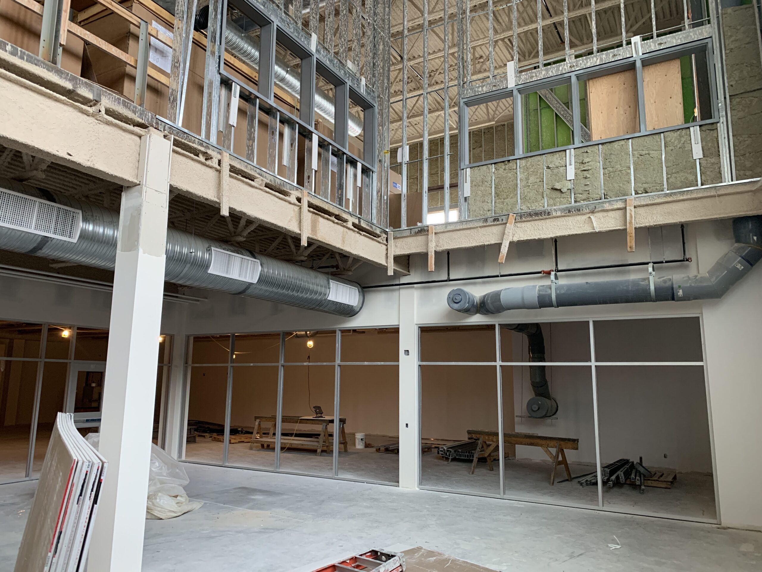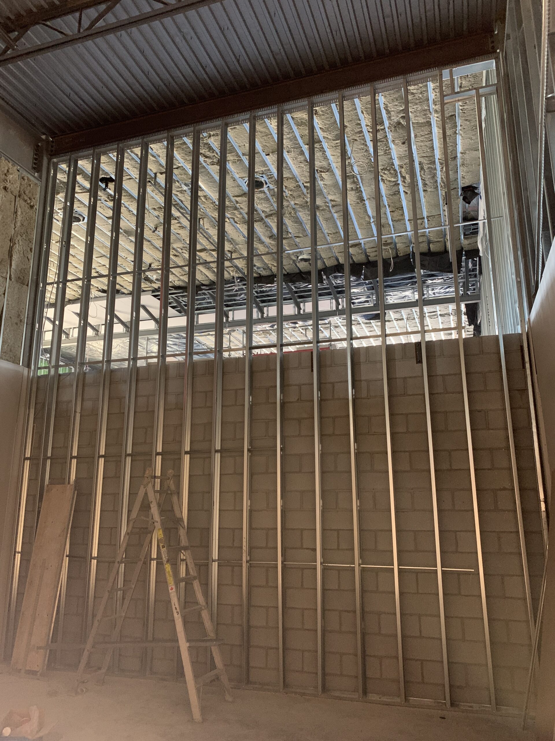 - Interior work continues including steel stud framing, insulation, drywall, mechanical rough-ins, electrical rough-ins, fire-spray, and primer/paint.