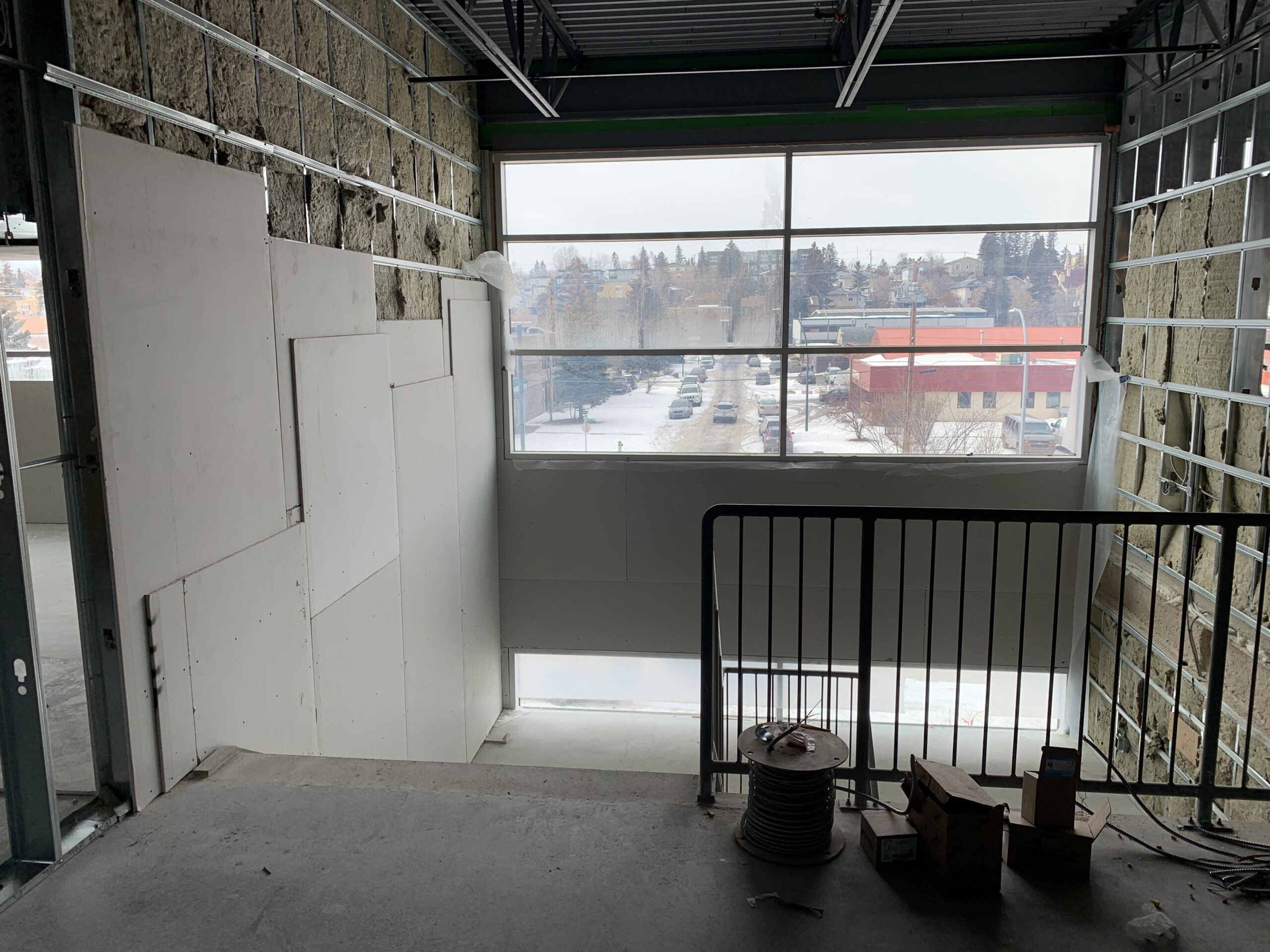 - Interior work continues including steel stud framing, insulation, drywall, mechanical rough-ins, electrical rough-ins, fire-spray, and primer/paint.